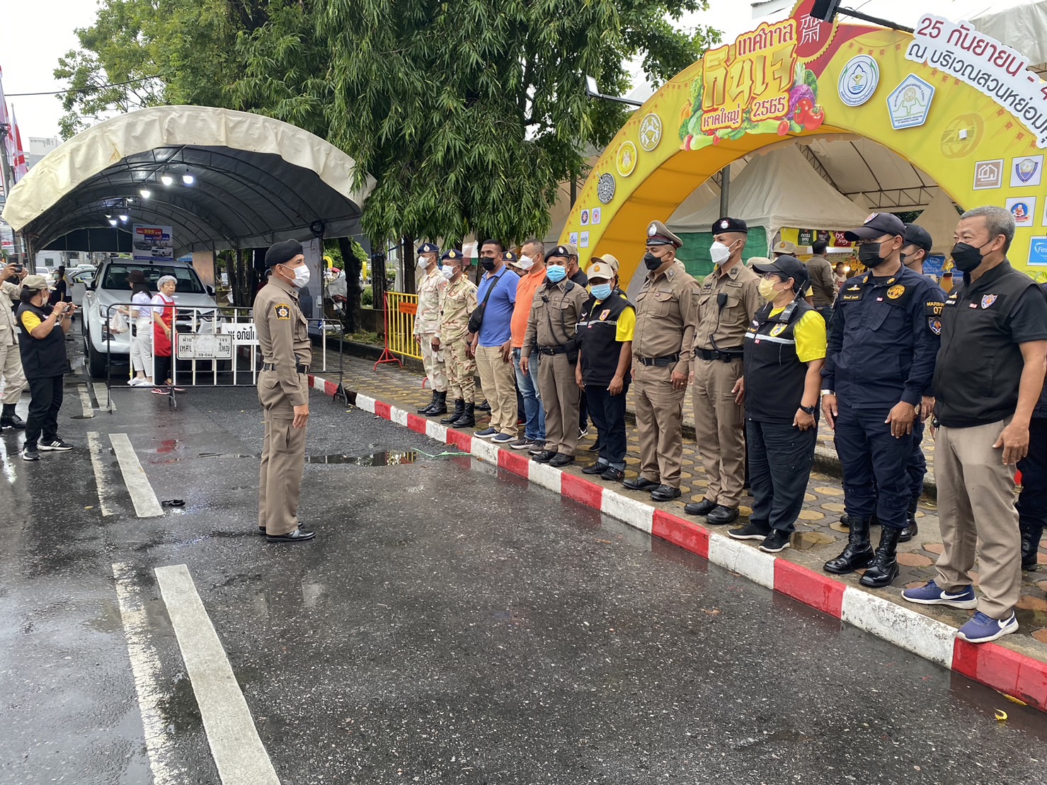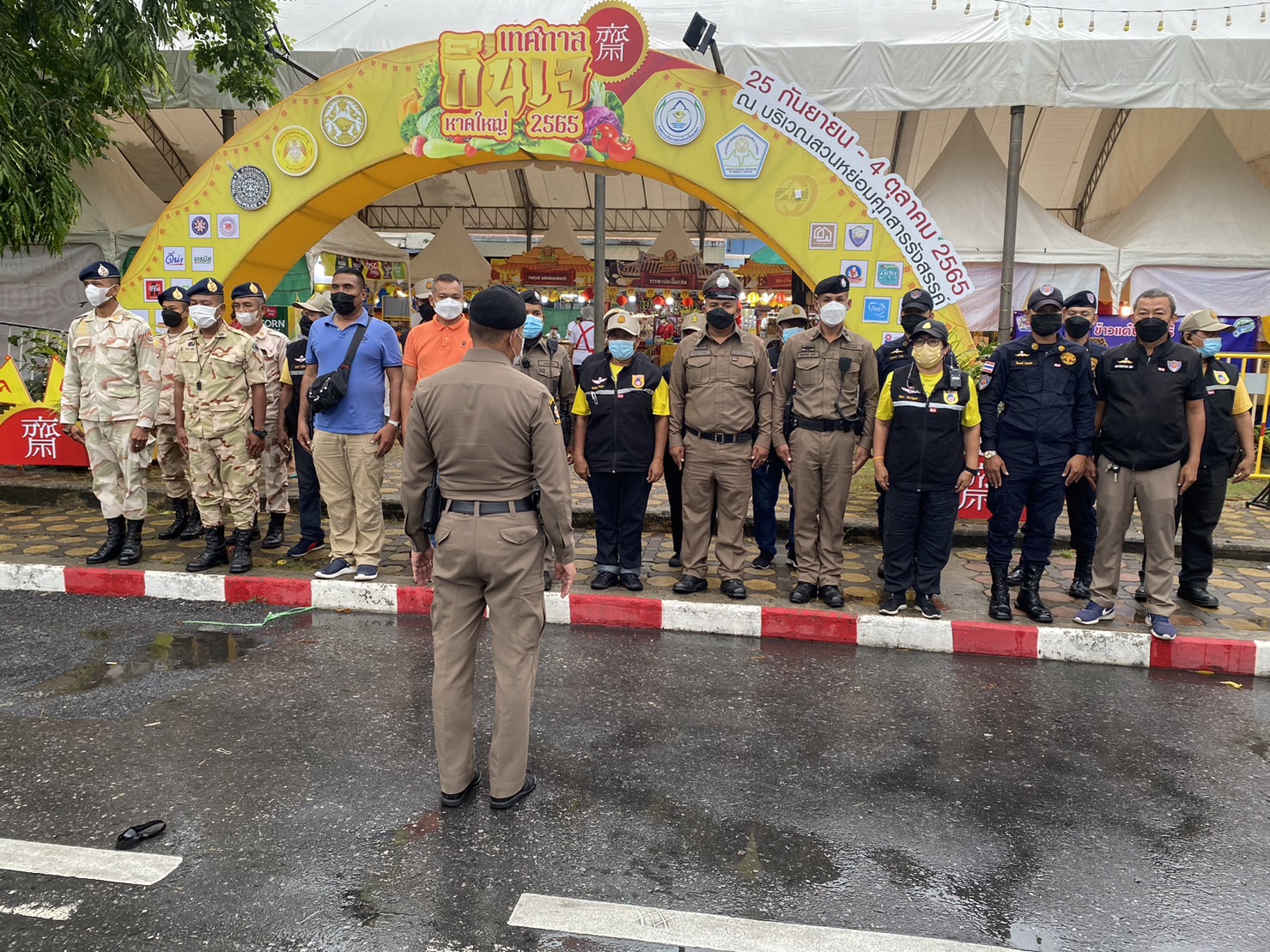 เรียกแถวเจ้าหน้าที่สามฝ่ายชี้แจงภารกิจ/แนวทางการปฏิบัติก่อนปล่อยแถวออก ปฏิบัติหน้าที่รักษาความปลอดภัยและอำนวยความสะดวกด้านการจราจร งานเทศกาลกินเจหาดใหญ่ ประจำปี 2565