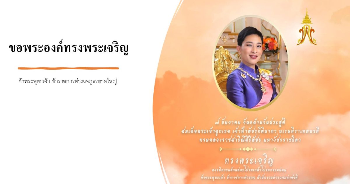 ขอพระองค์ทรงพระเจริญ 7 ธันวาคม 2565 โดย admin / ข่าวประชาสัมพันธ์ ๗ ธันวาคม วันคล้ายวันประสูติ สมเด็จพระเจ้าลูกเธอ เจ้าฟ้าพัชรกิติยาภา นเรนทิราเทพยวดี กรมหลวงราชสาริณีสิริพัชร มหาวัชรราชธิดา ทรงพระเจริญ ควรมิควรแล้วแต่จะโปรดเกล้าโปรดกระหม่อม ข้าพระพุทธเจ้า ข้าราชการตำรวจ สำนักงานตำรวจแห่งชาติ ระบบลงนามถวายพระพร (royaloffice.th) FacebookFacebookXXLINELine