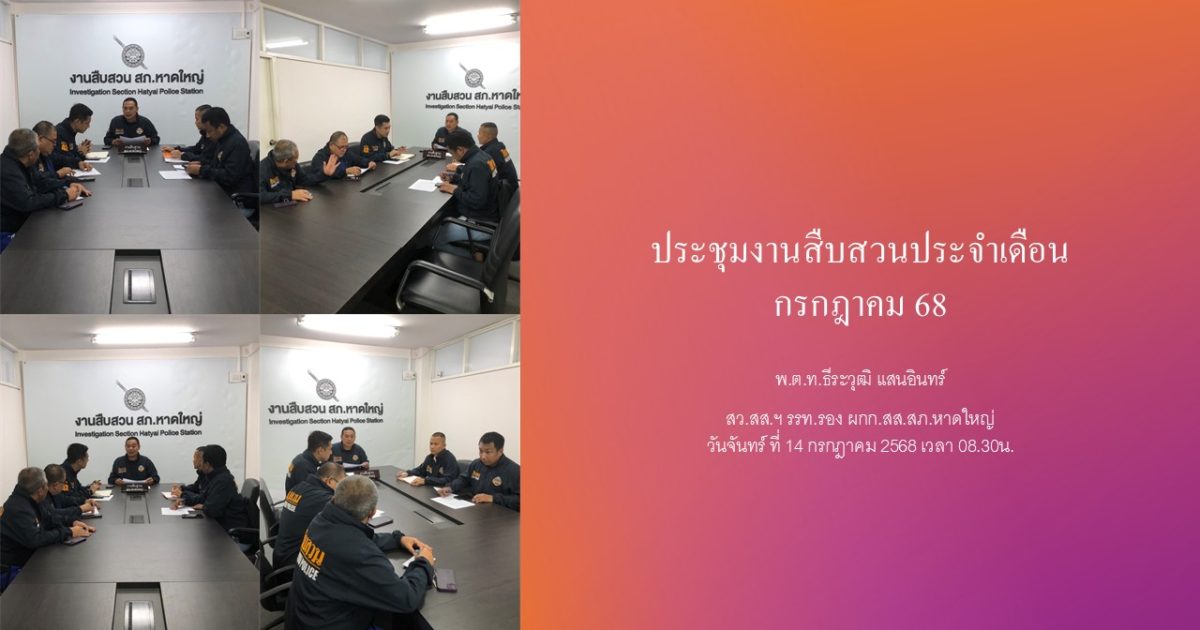 ประชุมสืบสวน ก.ค.68 14 กรกฎาคม 2568 โดย admin / ข่าวประชาสัมพันธ์,ข่าวกิจกรรม,งานสืบสวน ประชุมติดตามงานสืบสวน ประจำเดือน กรกฎาคม 2568 วันจันทร์ ที่ 14 กรกฎาคม 2568 เวลา 08.30น.พ.ต.ท.ธีระวุฒิ แสนอินทร์สว.สส.ฯ รรท.รอง ผกก.สส.สภ.หาดใหญ่พร้อมด้วย พ.ต.ท.สุรพัฒน์ อาดสะอาดพ.ต.ต.ธีรพงศ์ วิชิตและตัวแทนแต่ละ ชป.เข้าร่วมประชุมงานสืบสวนประจำเดือน เพื่อวางแผน เร่งรัด ผลการปฏิบัติตามตัวชี้วัด และการจับกุมตามหมายจับ และมอบรางวัลผลการปฏิบัติ ณ ห้องประชุมงานสืบสวน FacebookFacebookXXLINELine