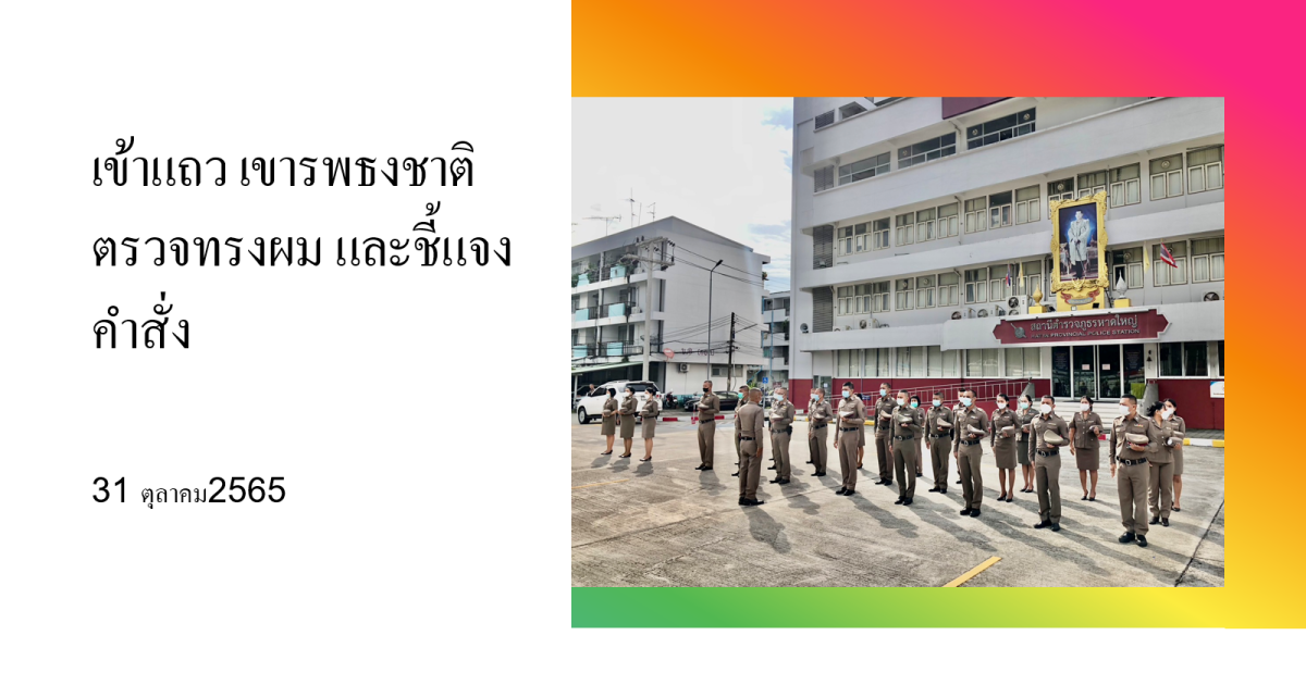 นำข้าราชการตำรวจ สภ.หาดใหญ่ ร่วมเข้าแถวเคารพธงชาติ บริเวณหน้า สภ.หาดใหญ่ พร้อมทั้งตรวจเครื่องแต่งกาย ทรงผม ให้ปฏิบัติตามระเบียบ ตามสั่งการของ ผบช.ภ.9