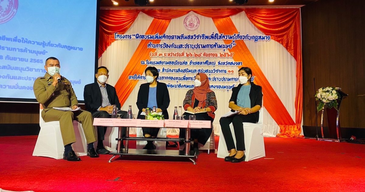 ร่วมเป็นผู้ให้ความรู้ในโครงการ “ฝึกอบรมเพิ่มศักยภาพทีม สหวิชาชีพ ด้านการป้องกันและปราบปรามการค้ามนุษย์ รุ่นที่ 3 ระหว่างวันที่ 26-28 กันยายน 2565 ณ โรงแรมสยามออเรียนทัล หาดใหญ่